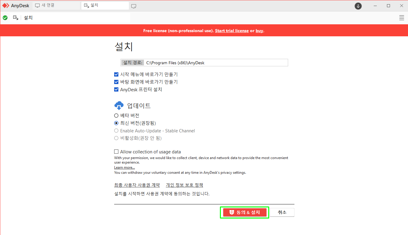 Step2. 설치경로를 선택한 후 [동의 및 설치] 버튼을 클릭하여 설치를 진행합니다.