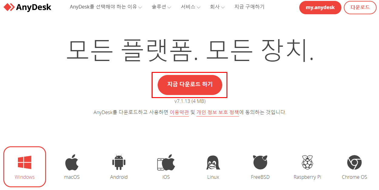 Step1. AnyDesk 공식 홈페이지에 접속해서 하단 OS를 Windows로 선택하고 [지금 다운로드 하기] 버튼을 클릭합니다.