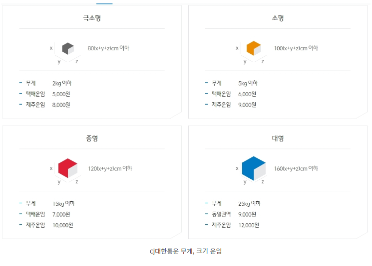 - 택배 비용은 극소형, 소형, 중형, 대형으로 구분되며 가로, 세로, 높이의 합의 길이와 무게를 결정하게 됩니다. 정해진 사항과 다를 시 사전 측정된 운임이 변경될 수 있으니 충분히 측정하고 선한 것이 중요합니다.