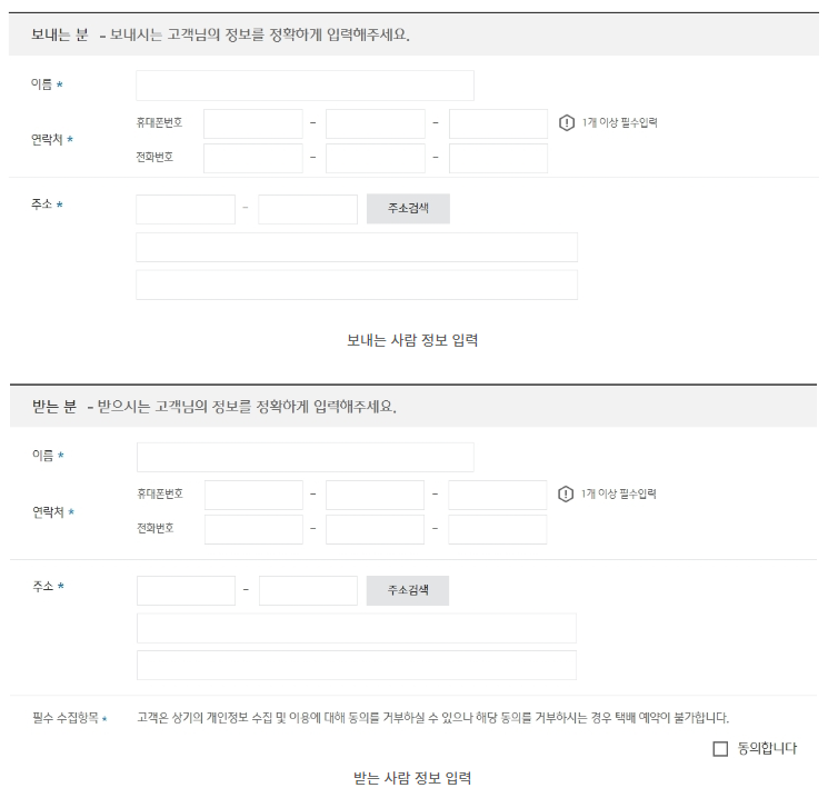 - 홈페이지에 접속한 다음 오른쪽 상단의 택배 조회/예약 > 택배 예약을 선택합니다. 선택 후 택배 예약하기 화면으로 전환되며 택배 배송을 위한 개인정보 이용의 동의를 진행합니다.