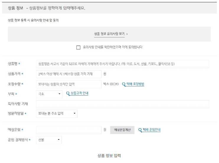 - 모든 정보를 입력하고 나면 상품의 상세정보를 입력하게 됩니다. 상품의 가격은 50만 원이 넘어가면 할증 배송료가 붙게 되고 부피에 따라 택배비가 결정됩니다. 모든 정보를 입력하면 예상 운임이 결정됩니다. 택배비 지불은 착불과 선물로 선택이 가능합니다.