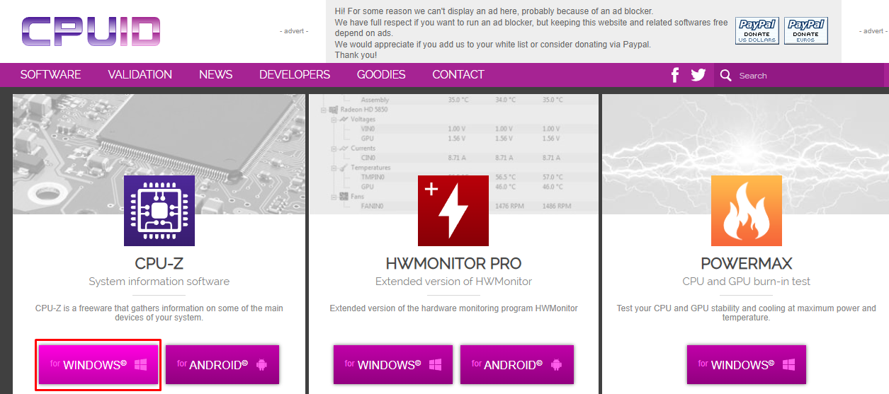 Step1 CPU-Z 홈페이지 접속한 후 아래 그림처럼 [WINDOWS] 버튼을 클릭합니다.