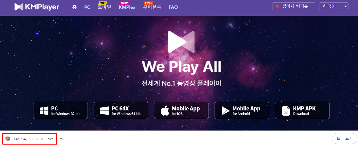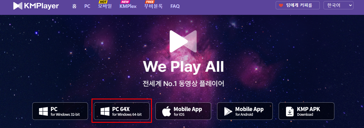 Step1. KM 플레이어 공식 홈페이지에 접속한 후 [PC 64X] 버튼을 클릭합니다.