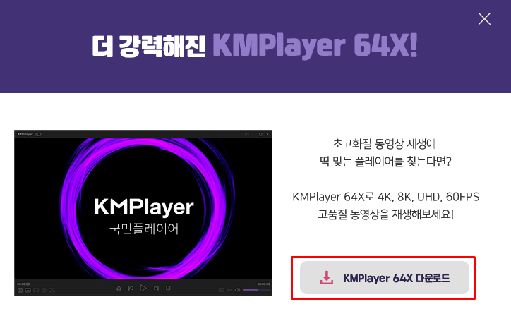 Step2. 다운로드 팝업페이지가 뜨고 [KMPlayer 64X다운로드] 버튼을 클릭합니다.